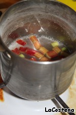 Нарезала их мелкими кубиками, залила водой и добавила сахар. Поставила вариться около 5-7 минут.