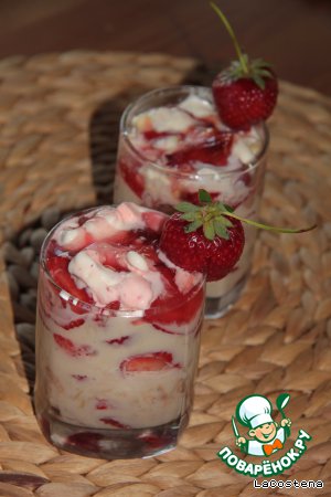 Летний легкий десерт с клубникой, мороженым, йогуртом и джемом из ревеня! Понравился тем, что готовится легко и быстро!