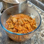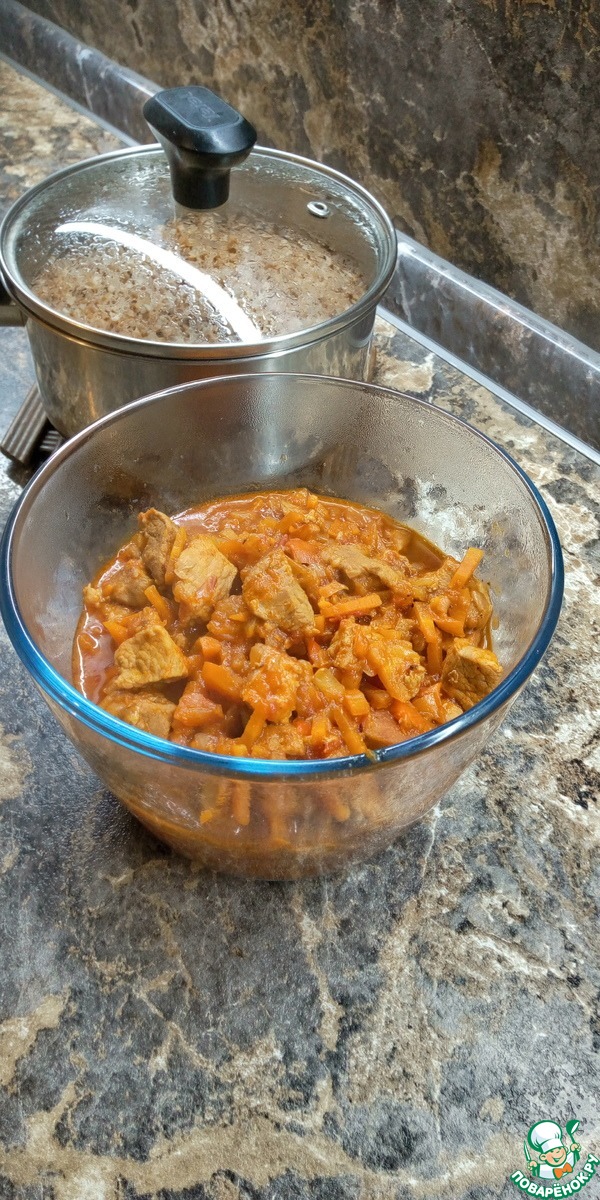 Добавляем помидоры и тушим до выпаривания жидкости. У меня помидоры были замороженные, поэтому жидкости было довольно много. Затем добавляем по желанию еще столовую ложку томатной пасты или кетчупа (кому что больше по вкусу) и немного воды. Пробуем на вкус, корректируем соль, специи, лавровый лист (для любителей кисло-сладкого вкуса можно добавить чуточку сахара). Тушим на медленном огне до готовности мяса.