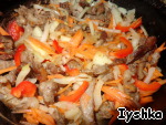 Когда мясо обжарилось, добавляем овощи и притушиваем под крышкой минут 10-12.