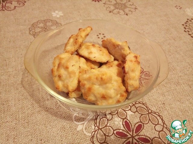 Берем противень, я сверху положила пергамент, смазанный подсолнечным маслом, и ложкой накладываем на противень куриную массу. Отправлем в духовку на 30-40мин, готовим до золотистого цвета.