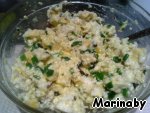 Моцареллу разминаем вилочкой, режем мелко камамбер, пармезан трем мелко