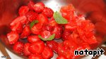 Клубнику (330 г) помыть, обсушить, добавить нарезанные помидоры, ваниль, воду и несколько листочков мяты. Варить 15 мин. на медленном огне.