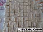 Раскатываем тесто толщиной в 5 мм и нарезаем квадратами 1,5*1,5 см.