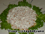 Салат выложить слоями, каждый слегка смазывая майонезом (я выкладываю майонез в полиэтиленовый кулечек, отрезаю уголок и просто наношу его сеточкой).