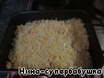 По истечении времени вынуть противень, посыпать мясо луком и чесноком и снова поставить в духовку на 15 минут.