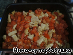 Затем снова вынуть противень, выложить на мясо кусочки помидоров,