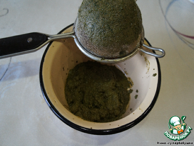 Положить листья в чашу блендера, влить 0,5 стакана сливок и очень тщательно измельчить. Затем протереть массу сквозь сито.