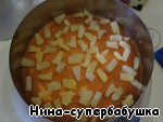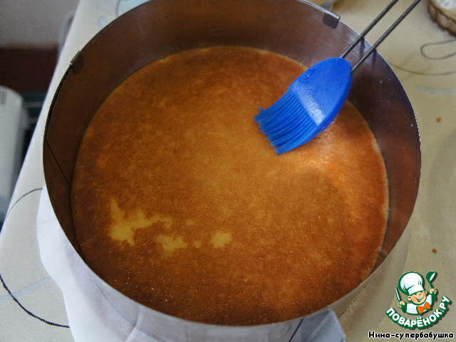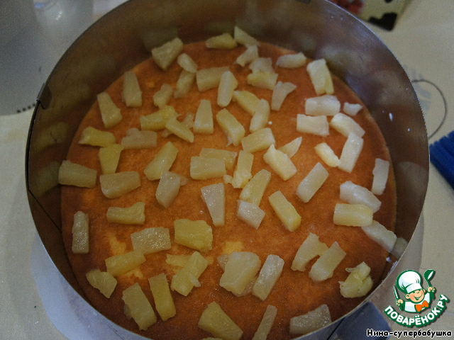 Вокруг коржа установить кольцо, на дно постелить кружок пекарской бумаги. Слегка смочить корж при помощи кисточки сиропом от ананасов.