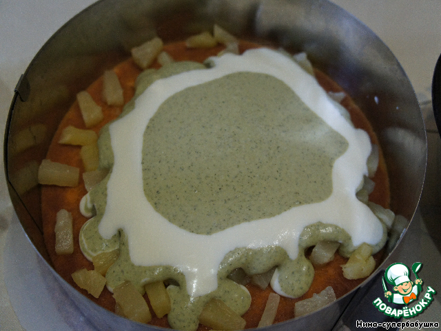 Поочередно наливать в центр коржа по 3 ст. л. белого и зеленого крема, чередуя их.