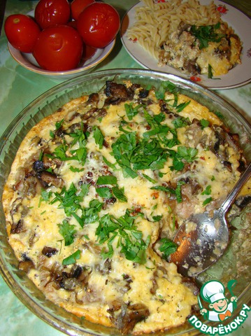 Яйца взбить с молоком, солью, перцем, залить мясо с грибами. Посыпать сыром. Запекать в разогретой духовке минут 30.