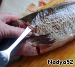 Делаю надрез кожи вокруг головы рыбы, беру обычную вилку столовую, тупым концом ввожу ее под кожу рыбы, отделяя кожу от мяса,