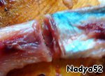 Дошли до хвоста рыбы, аккуратно отрезаем, чтоб хвостик и совсем маленькая часть хребта остались на шкуре.