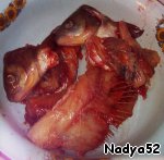 Теперь отделяем голову, вычищаем внутренности. В чашку складываем то, что нам понадобится в дальнейшем- шкура, голова и собственно тело рыбы без кишок.