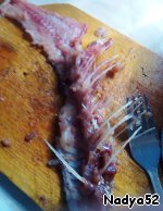 Очищаем вилкой, ножом мясо от костей, чтоб остался один скелетик. Так делаем с тремя рыбинами, т. к. на стандартный лист (противень) входит именно 3 рыбины граммов по 800 каждая.