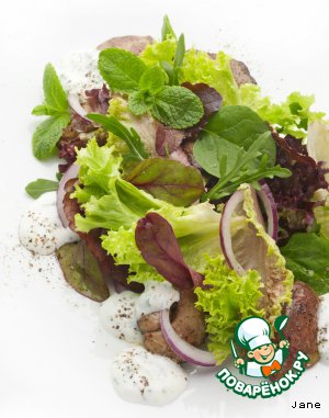Салат с куриной печенью, сладким красным луком и заправкой из йогурта и трав.