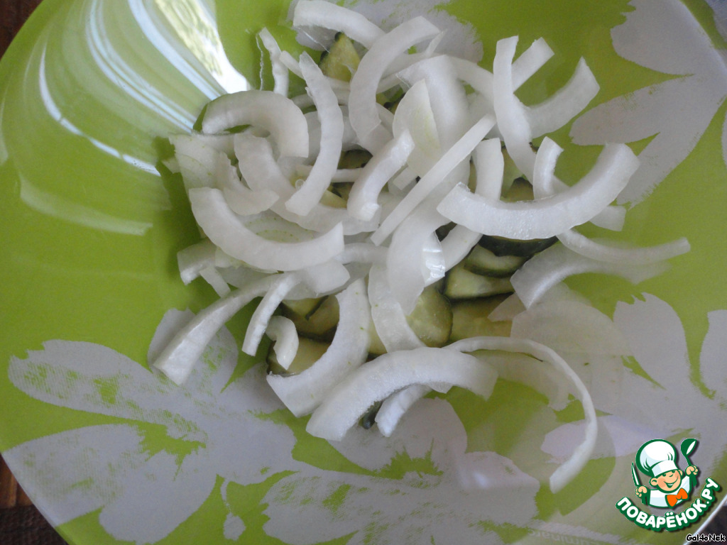 • Итак, приступим. Огурцы режем полукольцами.