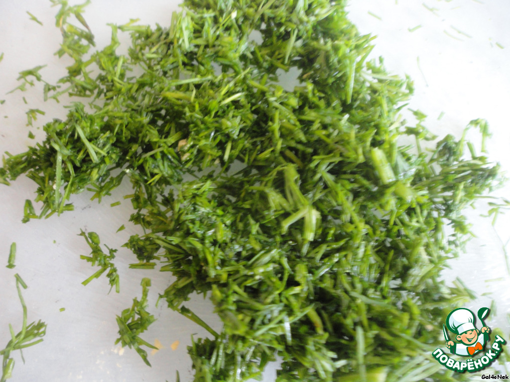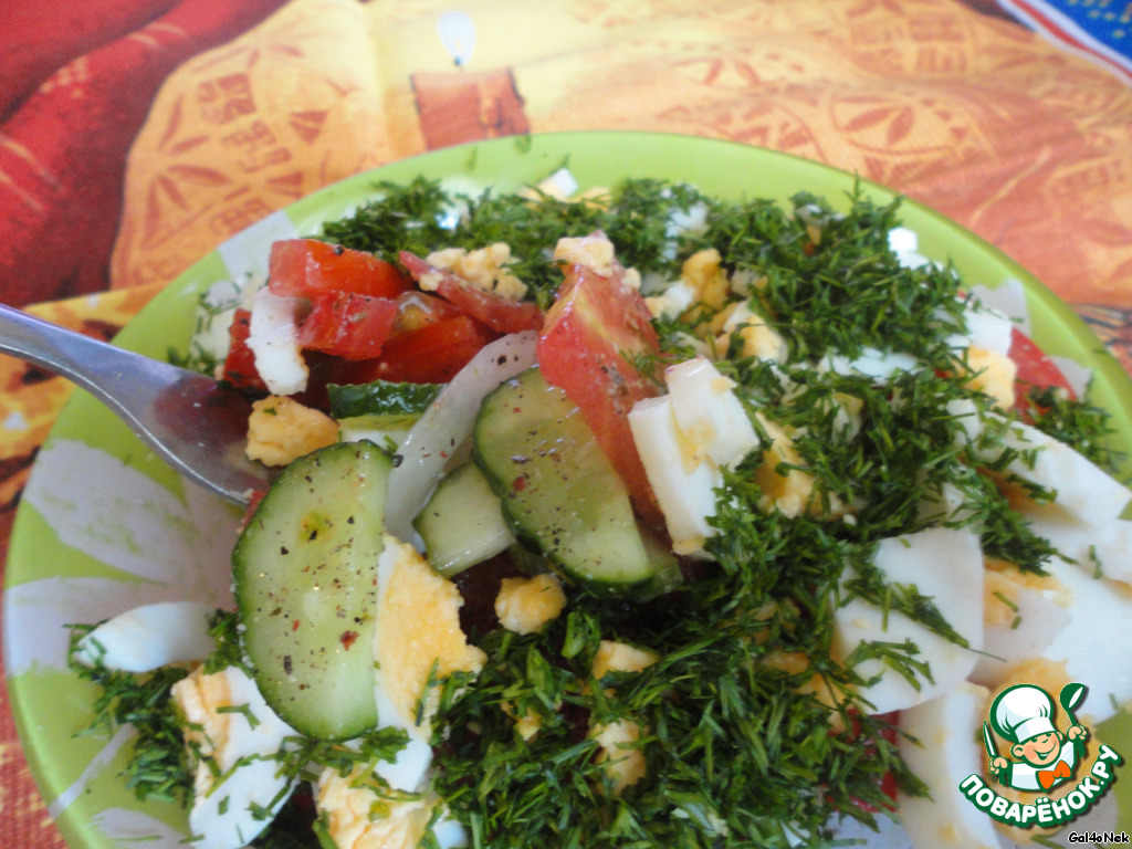 • Поливаем салат растительным маслом, укроп мелко рубим.