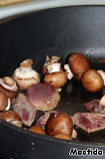 В разогретую сковородку наливаем масло, добавляем печень и шампиньоны - жарим 2-3минуты, почти до готовности.