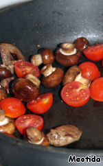 Когда печень и грибы будут почти готовы - добавляем в сковородку половинки помидоров черри, быстро обжариваем - буквально 20-30 секунд, снимаем сковороду с огня.