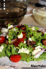 Сверху, на листья салата, выкладываем теплые ингредиенты, добавляем остатки заправки сверху и...