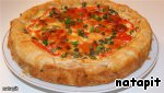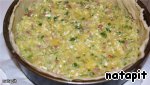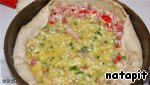 Хорошо перемешать и поместить в форму (26 см в диаметре), в которой предварительно выстелить слоёное тесто сделав высокие бортики.