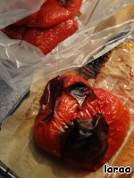 Перцы помыть, разрезать на половинки и вырезать плодоножки. С внутренней стороны натереть солью и перцем, можно мелко нарезанным чесночком. Перцы печем в духовке при 200°C, лучше под грилем до образования на них черной шкурочки. Вынимаем, складываем перцы в целлофановый мешок на 15 минут, потом чистим от шкурочки.