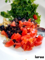 Приготовить соус. Для этого ингредиенты мелко нарезать и смешать с оливковым маслом и лимонной цедрой. Посолить и поперчить по вкусу.