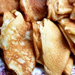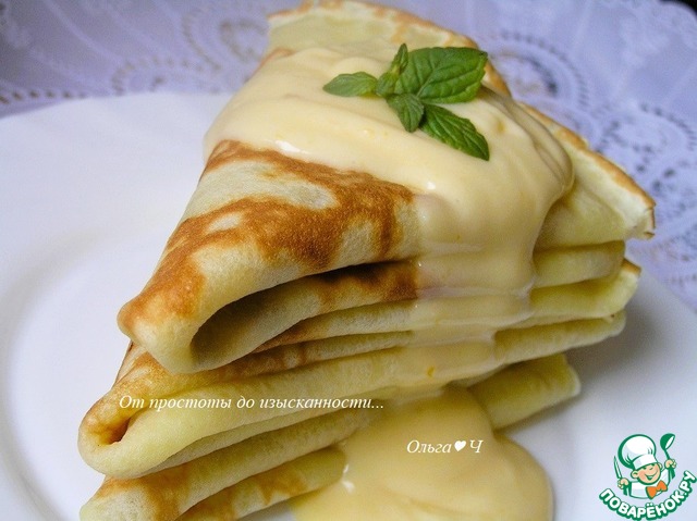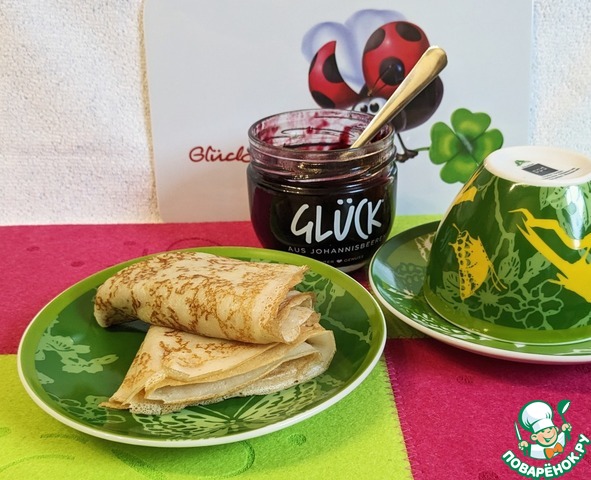 4) Выпекать с одной стороны, на сковороде складывать пополам и перекладывать в тарелку, смазывая каждый блинчик сливочным маслом. Подавать с чем любите! Я подавала с клубничным вареньем и со сгущeнкой.
