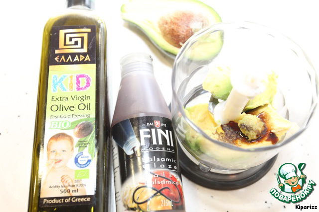 Авокадо очистить, пюрировать в блендере вместе с бальзамикой, ложкой оливкового масла и 1 ст. л. лимона. -