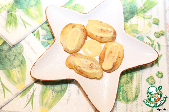 Выкладываем картофель квадратом в серединку наливаем соус №1, промазываем им картофель. -