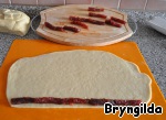 Раскатываю пласт теста и обрезаю край по линейке. Порезанный мармелад выкладываю на самый край и аккуратно, с помощью коврика заворачиваю мармелад в тесто в один слой с небольшим нахлестом. Рецепт моего мармелада https://www.povarenok.ru/recipes/show/63686/...