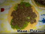 Обжариваем фарш минут 10-15, на тортильи выкладываем листья салата и сверху раскладываем фарш, оставляя свободные края.