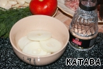 1 луковицу порезать кольцами и залить уксусом, отставить пока мариноваться.