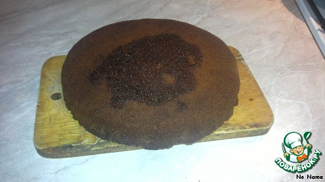 В большой емкости взбить сметану с сахаром. Орехи порезать не очень мелко. Таким же образом и чернослив. Все это перемешать со сметанным кремом и добавить 1 ст.л. какао. Готовый корж я режу на квадратики 2 на 2 и добавляю также в крем. Всю массу тщательно перемешиваю ложкой. Выкладываю торт на блюдо и формирую его в виде горки. -