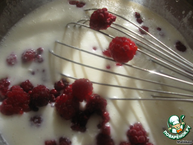 • Добавить малинку и потихоньку всыпать муку. Все перемешать, дать немного постоять. Муки может пойти больше, все зависит от густоты полученной смеси.