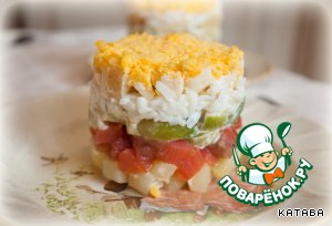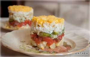 Вот и все готово. Салат с майонезом, но не все слои промазываются. Чтобы салат был красивый, слой, который должен быть с майонезом, рекомендую сначала смешать с майнезом в отдельной тарелке, а потом выкладывать.