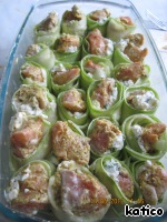 Несколько кабачковых лент выкладываем внахлест, кладем кусочек рыбы, сверху - 0,5 чайной ложки сливочного сыра с зеленью и сворачиваем в рулетик.
