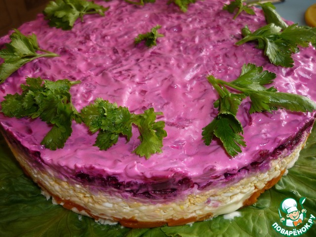5 слой - свекла, натертая на крупной терке (лишний сок немного отжать). Смазать майонезом.