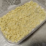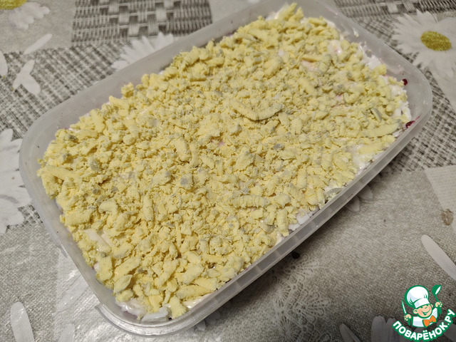 4 слой - яйца, натертые на крупной терке, и тонкий слой майонеза;