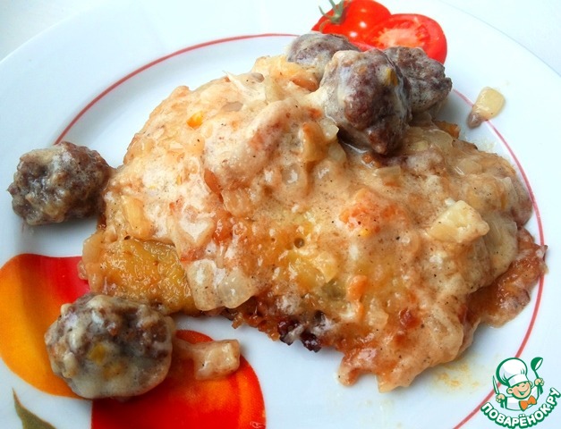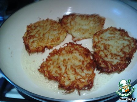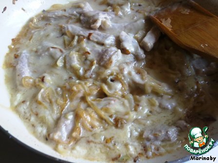 В обжаренную свинину с луком, добавляем сметану, разведенную с мукой, солим и перчим - готовим соус для наших драников.