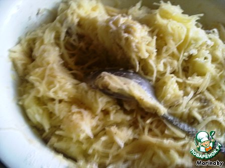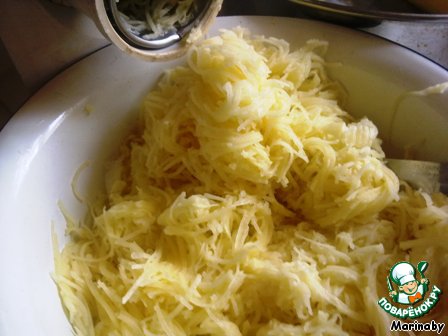 Очищенный картофель измельчаем на овощерезке или на картофельной терке