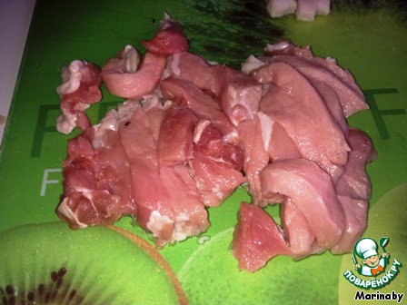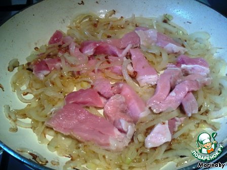 Обжариваем до золотистого цвета лук и добавляем свининку, немного обжариваем