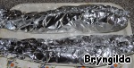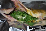 Рыбу выложить на фольгу и нафаршировать травой. Запечатать фольгу.
