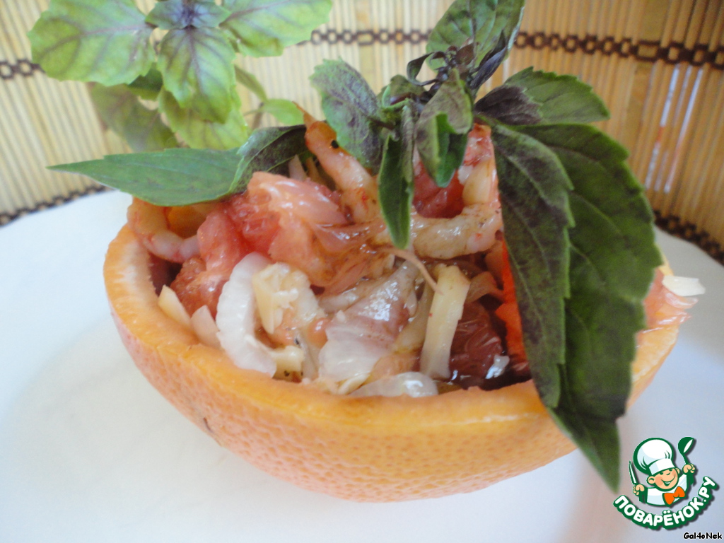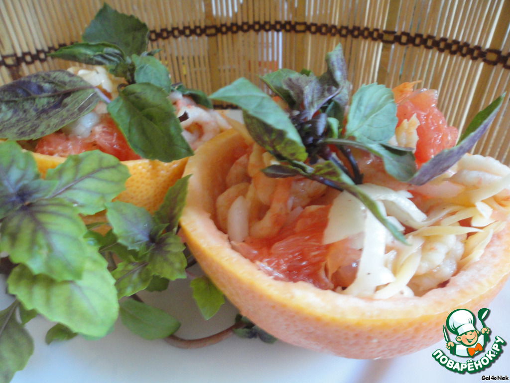 Выложить салат в половинки кожуры грейпфрута. Украсить листьями базилика. |