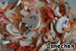 Луковицу нарезать полукольцами, морковь соломкой. Нарезать шампиньоны и перец болгарский красный. Помидоры черри разрезать пополам.