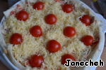 Выложить половинки помидоров черри сверху сыра. Запекать в разогретой до 180 градусов духовке.