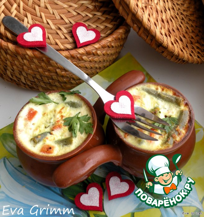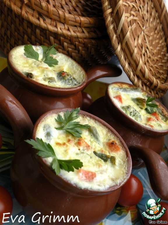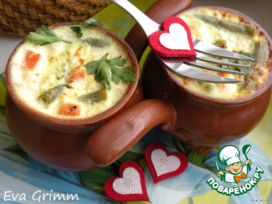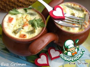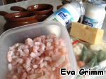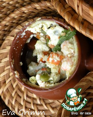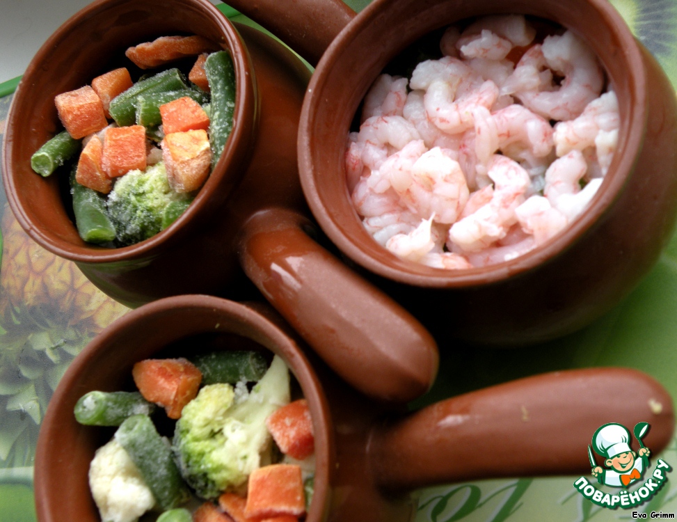 Выкладываем слоями: креветки-овощи-креветки-овощи в кокотницы и каждый слой заливаем полученной смесью