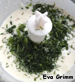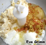В блендере смешаем сыр, йогурт, яйцо, специи