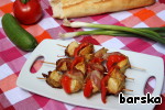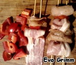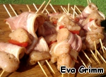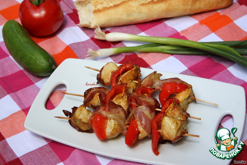 Насаживаем на шпажки вот таким образом курочку, чередуя с беконом и овощами, хорошо будет держаться на 2 шпажках каждый шашлычок